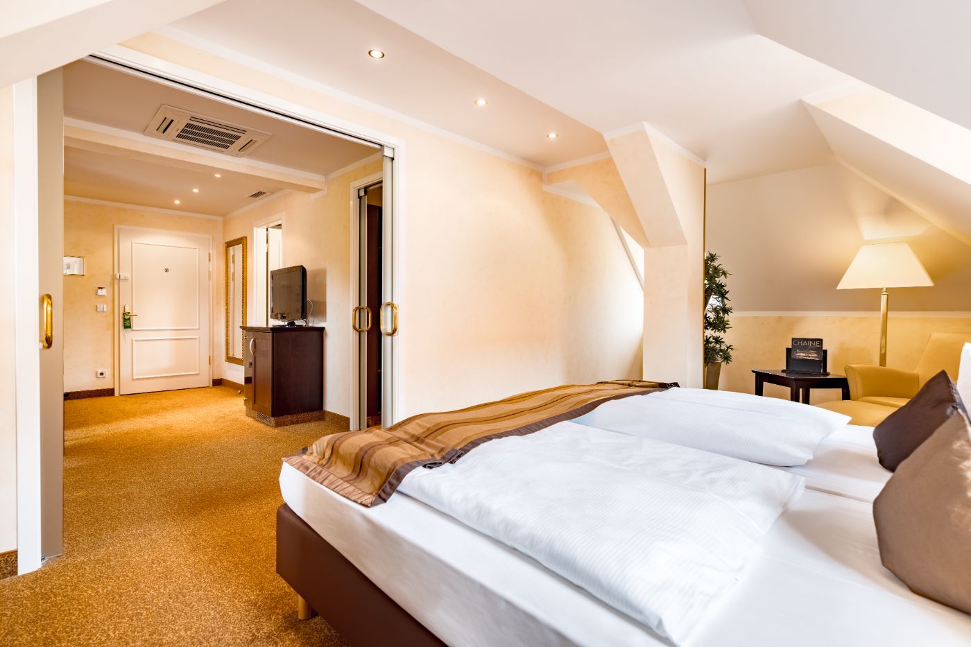 Groß und luftig. Unsere Junior Suite ist was ganz Besonderes. Die Dachschrägen des historischen Bauwerks verleihen ein Gefühl von Gemütlichkeit und dennoch genießen Sie in unserem Anselm-Schott-Haus Freiheit pur. Das Zimmer ist mit einer Couch, einem begehbaren Kleiderschrank und einem geräumigen Badezimmer mit Dusche und Badewanne ausgestattet. Egal ob zu zweit oder mit Familie: wer viel Platz braucht, ist hier richtig.
